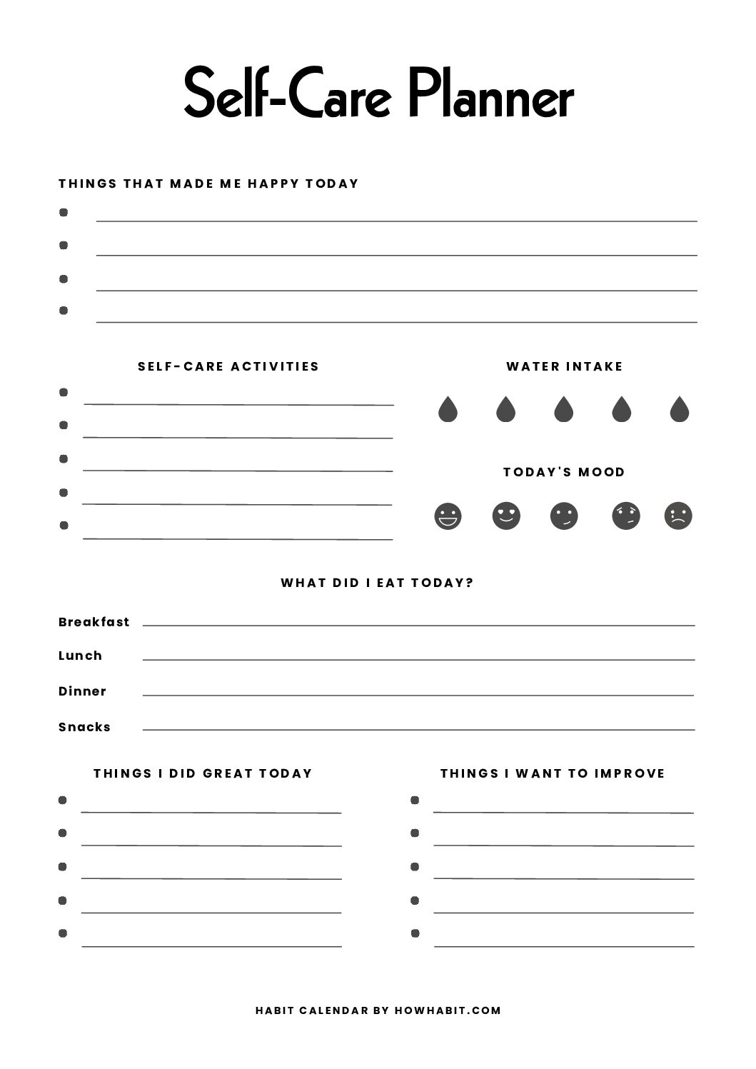 Add photo evidence. Take quick phone photos of your meals or self-care activities and add them to a folder labeled with the date. Visual documentation helps memory and makes reviewing even more powerful.